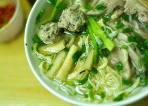 Rẻ chỉ là một tiêu chí, bún Nguyễn Chế Nghĩa còn ngon thực sự. Nước dùng ở đây ngọt lắm, đúng kiểu ngọt chất, được chế biến từ nước ninh xương và nước luộc gà. Gọi là bún mọc nhưng mỗi bát bún ngoài 2 loại mọc giò và mọc thịt mộc nhĩ thì còn có măng khô, rất nhiều hành củ và thịt gà. Nếu tinh miệng thì bạn sẽ phát hiện ra thịt gà của tiệm cũng được chọn loại “xịn”, thịt chắc bùi chứ không hề bở bùng bục như nhiều nơi.