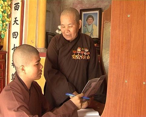 | Sư thầy Phương trao đổi về phật học với sư Thích Diệu Ngọc. |