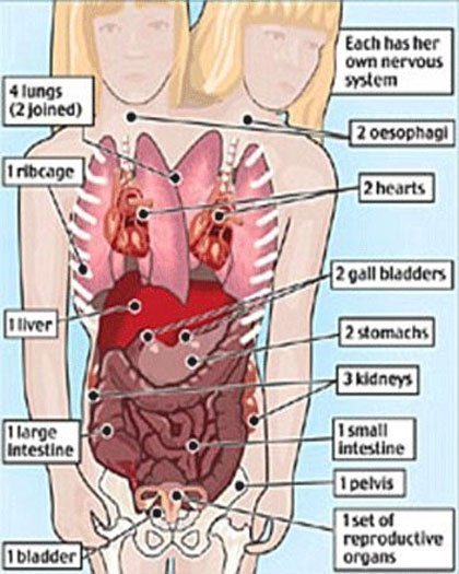 Hai chị em có 2 xương sống và nối với nhau ở khung chậu, họ có 2 gan, 2 trái tim, 3 quả thận, 2 dạ dày, 4 phổi, và 2 cánh tay (một cánh tay phát triển không hoàn toàn ở giữa cơ thể đã bị cắt bỏ khi họ còn nhỏ).