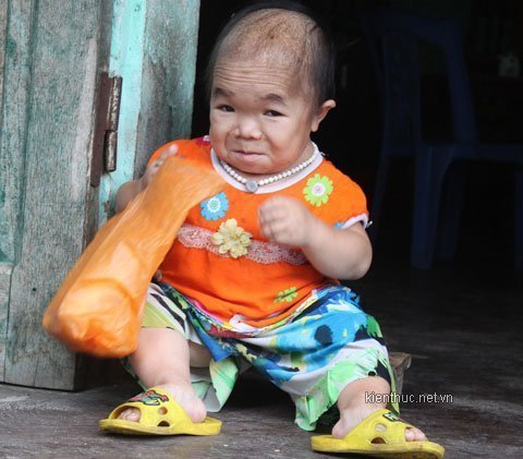 Thoạt nhìn, người lạ sẽ tưởng đó chỉ là một bé gái 3 tuổi ngồi bên cửa nhà. Nhưng nhìn kỹ, hỏi ra mới biết "em bé" đó là một cô gái đã 22 tuổi. Đến nay cô gái ấy mới chỉ cao được 70cm, nặng 12kg và bập bẹ tập nói.