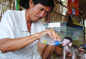 | Kỹ sư Nguyễn Tấn Truyền chăm sóc một con khỉ con bị lạc mẹ ở rừng U Minh Hạ. |