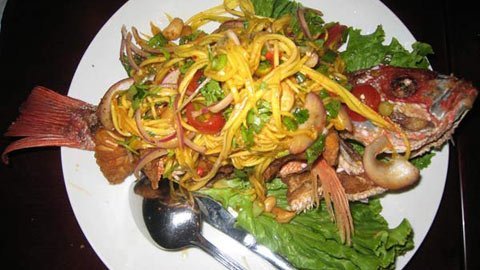 Yam Pla Duk Fuu là tên gọi của món cá rán giòn ăn kèm với salad rau và xoài. Cá được chiên cả con, thường là cá trê, tẩm ướp gia vị có pha chút cay đậm chất Thái, khiến du khách nếm thử một lần nhớ mãi không quên.