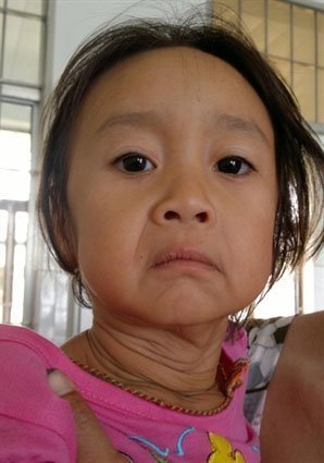 Cháu Trần Thị Ái Trân, con của vợ chồng anh Nguyễn Thanh Sắc và chị Trần Thu Trang, ngụ ấp 9, xã Khánh An, huyện U Minh tỉnh Cà Mau sinh năm 2009, nghĩa là mới 3 tuổi nhưng sau khi bị bệnh, khuôn mặt bỗng nhiên biến dạng trở thành như bà già 60 tuổi.