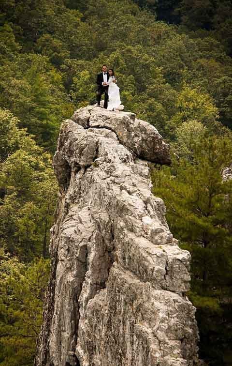 Hình ảnh cô dâu và chú rể đứng cạnh nhau trên đỉnh núi cao 900 ft (274m) để chụp những bức ảnh cưới "độc" đã trở thành tâm điểm chú ý của cư dân mạng