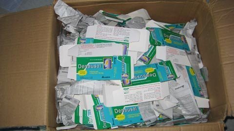 | Thuốc Denausal - có chỉ định điều trị viêm mũi dị ứng và cảm cúm thông thường, do Công ty CP dược Vacopharm (Long An) sản xuất - bị thu gom về chiết tách lấy lại tiền chất PSE để tổng hợp thành ma túy “đá” (Ảnh: TTO) |