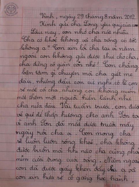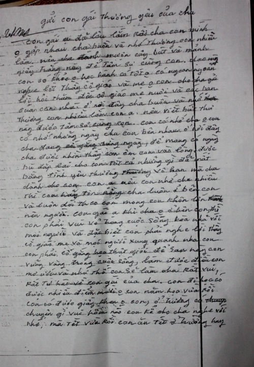 Mở đầu lá thư có đoạn: "Con gái ạ! Đã lâu lắm rồi cha con mình không gặp nhau. Ở nơi đây cha buồn và nhớ thương con nhiều lắm. Con có nhớ cha, nhớ những ngày cha con mình được bên nhau? Ở nơi đây cha đang cố gắng từng ngày, để mong có ngày cha được nhìn thấy con, ôm con vào lòng, được bù đắp lại cho con tất cả những gì đã mất bằng tình yêu thương vô hạn mà cha dành cho con.