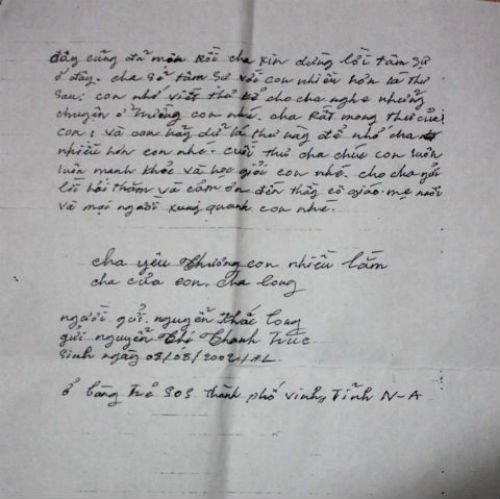 Trong những tháng ngày nằm xiềng chờ chết, tử tù Nguyễn Khắc Long đã viết bức tâm thư từ ngục tối gửi con gái là Nguyễn Thanh Trúc, năm nay bước chân vào lớp 2, rồi nhờ cán bộ trại giam chuyển giúp. Tôi được xem bức thư đó và không khỏi xót xa khi đọc nó. Bức thư thấm đẫm nước mắt gửi trọn hết tình yêu của người cha tử tội cho đứa con duy nhất đang được nuôi dưỡng tại trại trẻ mồ côi SOS TP. Vinh.