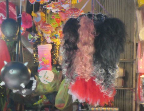 | Tóc giả là mặt hàng được nhiều bạn trẻ cá tính lựa chọn. Những bộ đồ chơi cánh tiên, mặt nạ, gọng kính hình thù ngộ nghĩnh, bờm nơ, tóc giả, mặt nạ kinh dị bằng da…chỉ từ dao động từ 30.000 - 50.000 đồng. |