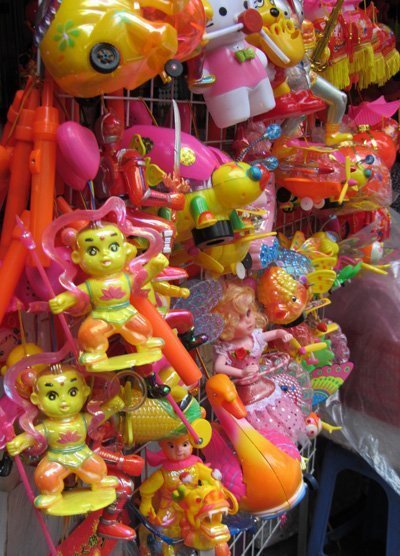 | Một số đồ chơi Trung Quốc có mùi nhựa hắc nhưng vẫn bán chạy nhờ màu mè, lạ mắt và giá rẻ. |