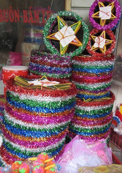 | Một người phụ nữ đã mang cả cây đèn ông sao ra đứng giữa ngã tư đường nhưng vẫn không bán được nhiều. Tùy theo kích cỡ, đèn ông sao truyền thông có giá từ 7.000 - 50.000 đồng/chiếc. |