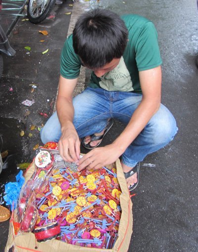 | Đã 3 năm nay, trống bỏi giữ giá 3.000 đến 5.000 đồng/chiếc nhưng mặt hàng vẫn khó bán vì không bắt mắt và gây tiếng ồn nhiều người cho là "khó chịu". Trong ảnh bạn Lê Đức Thọ, SV K56, ĐH Xây dựng đang chọn 1 cái trống bỏi. |