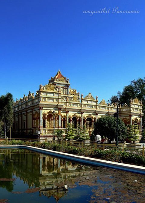 Chùa Vĩnh tràng với kiến trúc đậm Angkor nổi bật trong ánh nắng.