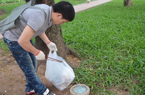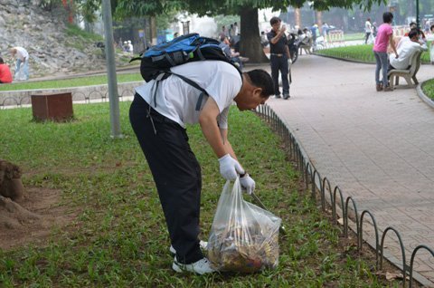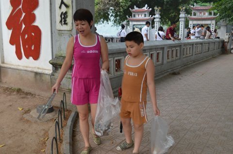 | Chị Hằng (Lê Văn Hưu, Hà Nội) vài tháng nay, sáng Chủ nhật nào chị cũng cho con trai 11 tuổi ra Hồ Gươm nhặt rác. Chị bảo, một lần cho con đi ăn kem ở Tràng Tiền, cháu hỏi: “Sao có thùng rác bên cạnh mà người ăn kem vẫn vứt ra đường thế mẹ?”. Bằng việc tham gia hoạt động này, chị muốn cho con biết, người lớn không phải ai cũng vô ý thức. |