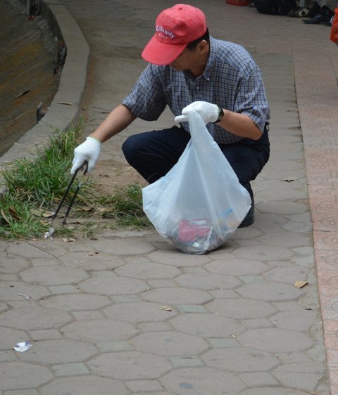 | Ông Ninomiya cặm cụi nhặt từng mẩu thuốc lá, từng bã kẹo cao su quanh Hồ Gươm |