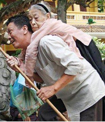 | Bức đăng tải ngày 14/8/2012 trên mạng xã hội facebook cũng gây xúc mạnh. Trong bức ảnh, theo nhiều người, đó là một người đàn ông trung niên cõng người mẹ già của mình lên chùa thắp hương. Bức ảnh đã lay động tình mẫu tử của nhiều bạn trẻ. |