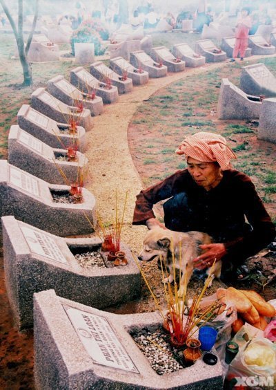 | Bức ảnh có tiêu đề “Tháng 7: Thăm con” của tác giả Huynhdungphoto trên web Xóm Nhiếp Ảnh và lời đề tựa: "Tháng 7, mẹ đón xe đò lên thành phố, vào nghĩa trang liệt sĩ thăm con trai. Những bánh, trái, thuốc lá... ngày nào con vẫn thích mẹ mang cho con cả..."- Người Mẹ Liệt Sĩ. Mặc dù còn nhiều nghi vấn nhưng bức ảnh cũng đã ghi lại được một khoảnh khắc đầy xúc động và đầy tính nhân văn |