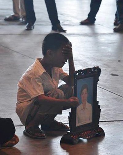 | Bức ảnh này được chụp tại sân bay Nội Bài vào ngày 23/9 khi người thân ra đón thi hài của các nạn nhân thiệt mạng trong vụ cháy xưởng may tại Nga khiến 14 công nhân Việt Nam thiệt mạng hôm 11/9. Trong ảnh là em Nguyễn Ngọc Minh, 10 tuổi, ôm di ảnh mẹ là chị Trần Thị Châu (sinh năm 1972) quê Nam Đàn, tỉnh Nghệ An. Mẹ Minh đi sang Nga lao động khi em còn học mẫu giáo, giờ em đã lên lớp 4. Ôm di ảnh mẹ, khi nhận hộp tro cốt, cậu bé dàn dụa nước mắt. Sau Minh, còn một em trai 4 tuổi. Ngay khi hình ảnh cậu bé này được đăng tải trên một số báo, nó đã được dân mạng truyền tay nhau với niềm đau xót lớn lao (Ảnh Tiin.vn) |