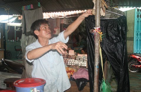 khăn nên ông Minh lấy tấm bạt vây chung quanh để cụ đi vào bô rồi đem đi đổ.