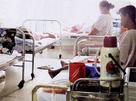 đi khám phải ngồi trên vỉa hè đường Tràng Thi ngóng vào với mệt mỏi, lo lắng. Ảnh: Infonet |