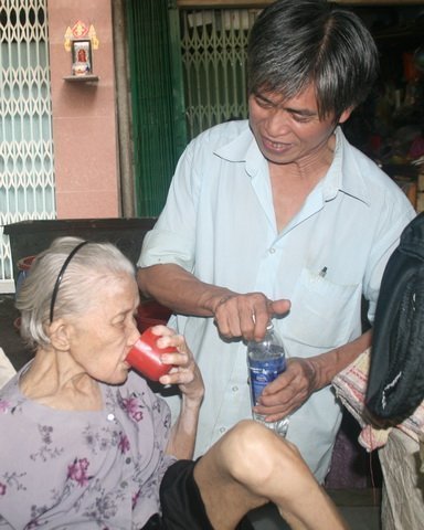 | Ông Minh tận tình chăm sóc cụ Xảo. |