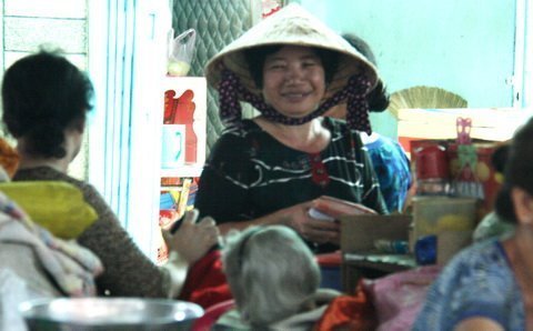 | Tiểu thương vây quanh bà. Ông Minh đứng phía sau với nụ cười trên môi. |