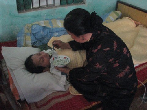 Hỏi đường mãi, chúng tôi cũng tìm về được xóm 4, thị trấn Ba Hàng, huyện Phổ Yên, tỉnh Thái Nguyên. Trời đã quá chiều, bà Nguyễn Thị Lợi đang trệu trạo nhai và mớm những thìa cơm cho bữa ăn thứ 5 trong ngày cho chồng, bước vào tuổi cổ lai hy đang nằm liệt giường. Nhìn cảnh tượng ấy, chúng tôi không thể không rớm nước mắt.