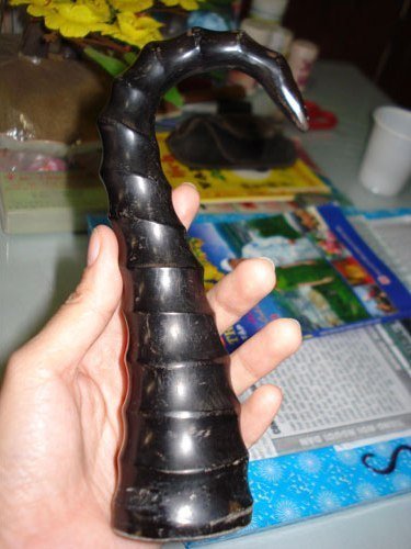 trên bàn thờ, rồi mở hòm gỗ lấy cho tôi xem một chiếc sừng màu đen tuyền, cong