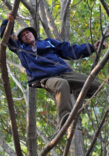 | Cành dẻ rất dai, anh Quang thường phải đu người rung cành cho quả dẻ rơi xuống. |