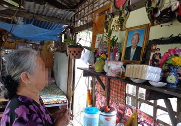 | Bà N. trước bàn thờ chồng và tổ tiên gắn tạm trên vách căn chòi sửa xe đạp của người con rể. Ảnh: PLTP |