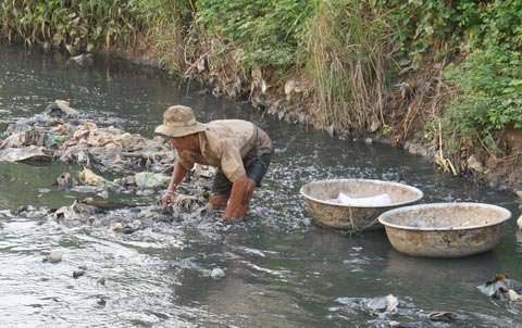 Người đàn ông vẫn cặm cụi, mò mẫm trong dòng nước đen kịt. Thỉnh thoảng ông đưa tay ra bốc ra một mảnh nhựa, hay nhặt lấy một thanh sắt. Nhúng vào dòng nước đen, ông rửa sơ vật tìm được rồi cho vào trong chiếc thau nhôm. Cứ như thế, ông đi dọc bờ bên phải rồi quay ngược lại ở bên bờ trái. Đôi chân ông chìm trong sình lên đến gần đầu gối, đôi mắt chăm chú nhìn vào lớp sình trên mặt kênh.