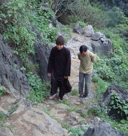 Sư thầy Thích Đàm Mơ dẫn chúng tôi vào hang Thánh Hóa, chỉ nơi tổ Thủy Nguyệt ngồi kiết già và hóa. Phía trần hang có một vệt lõm vào núi, đúng kích thước đầu người. Phía đáy hang có một vết lõm hình bàn chân người. Huyền thoại kể rằng, khi sư Thủy Nguyệt đắc đạo, ngài đã thúc đầu, đạp chân vào núi đá khiến cả quả núi rung chuyển.