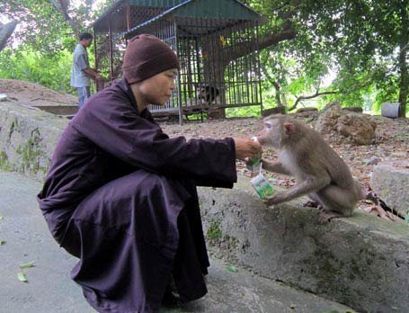 | Sư thầy Thích Đàm Mơ nổi tiếng là người nhân từ khi bà bỏ tiền mua lại những chú khỉ từ bọn buôn bán, chăm sóc, thả chúng về núi |