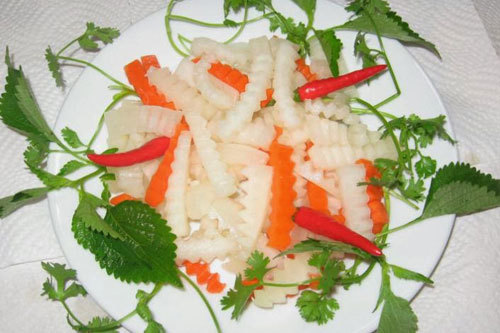 - Chế biến: Dùng su hào 1/2 củ, cà rốt 1/2 củ hành lá vài nhánh, dưa leo 1 quả, đường, mắm, gia vị, dấm, ớt tươi.