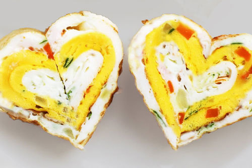Tiếp tục rán phần lòng trắng trứng, đến khi nó hơi đông lại thì đặt cuộn lòng đỏ lên trên và cuốn lớp lòng trắng bọc lấy phần lòng đỏ, lăn qua lại rồi gắp trứng ra. Chờ trứng nguội đi một chút dùng dao thái trứng thành từng khoanh mỏng khoảng 1,5cm. Với mỗi khoanh trứng, đặt dao xắt một đường chéo ở giữa khoanh, sau đó xếp hai miếng với một miếng đặt theo hướng ngược lại là bạn đã tạo được một miếng trứng hình tim.