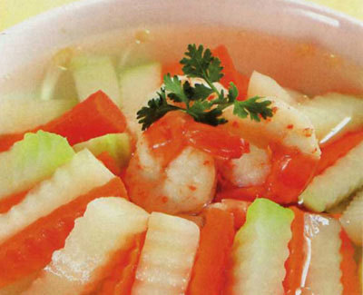 - Cách làm: Cho hỗn hợp nước vừa pha được vào trộn đều cùng su hào, cà rốt, hành lá. Để 30 phút trong ngăn mát tủ lạnh.
