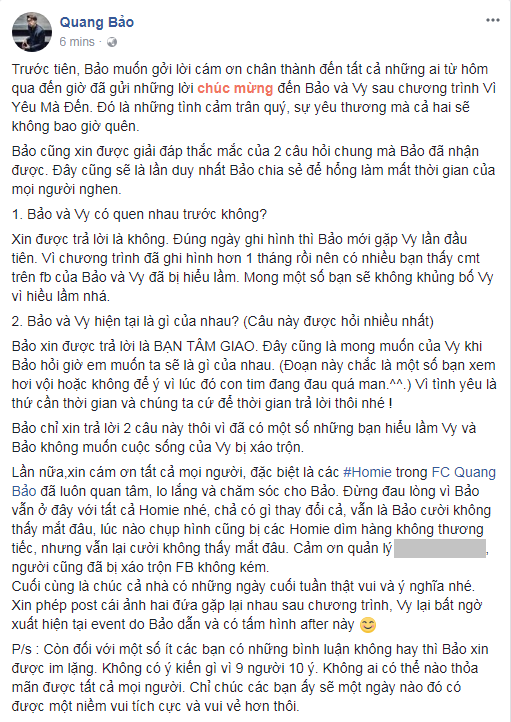 | Tâm thư của MC Quang Bảo trên trang cá nhân |
