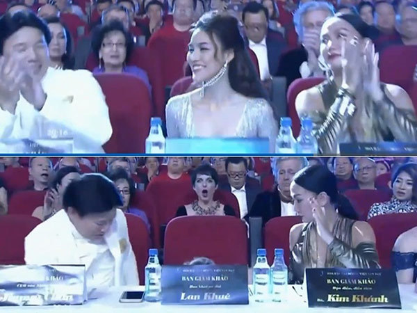 | Lan Khuê lọt thỏm xuống sân khấu vì bị té ghế |