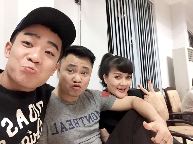 Duy Nam chụp ảnh cùng nghệ sĩ Tự Long và Vân Dung ở hậu trường Táo quân. Ảnh: NVCC.
