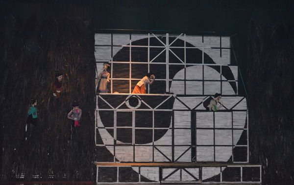 Bằng sự sáng tạo của mình, tập thể diễn viên Nhà hát Múa rối Thăng Long đã thử nghiệm bằng dựng vở bằng loại hình rối cạn. Sân khấu mở ra với vỏn vẹn hình bàn cờ với khối màu đen trắng, hai bên là những mái lá, mọi diễn biến kịch diễn ra tại đó. Bằng việc sử dụng xen kẽ những hình rối với cả diễn viên thật, toàn bộ câu chuyện được hiển hiện.