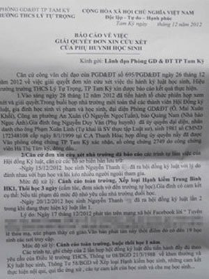 Với nick name Kang..., nữ sinh Nguyễn Thanh V. học sinh lớp 8/6 Trường THCS Lý Tự Trọng tại phường An Xuân, TP.Tam Kỳ, Quảng Nam lập trang Facebook và đã biết bài cùng ra lời "kêu gọi" học sinh phải bằng mọi cách, kể cả những cách tiêu cực để vượt qua đợt kiểm tra học kỳ 1 ở trường.