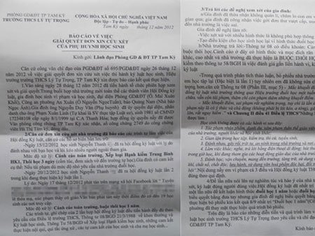 Trong khi đó, ông Lê Văn Chính, phó giám đốc Sở GD-ĐT Quảng Nam cho biết đang hối thúc thanh tra Sở vào cuộc và đã chỉ đạo Phòng giáo dục TP Tam Kỳ báo cáo ngay vụ việc.