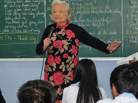 | Năm nay 82 tuổi, cô Đàm Lê Đức vẫn miệt mài trên bục giảng dạy về đức dục. |