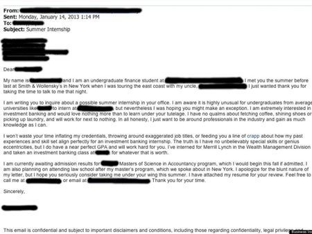 Bức thư đề ngày 14/1 viết: “Tôi viết bức thư này để xin được thực tập ở công ty ông. Tôi biết thật không bình thường khi một sinh viên năm cuối tới từ một trường đại học bình thường như… xin thực tập tại công ty…, tuy nhiên tôi vẫn hi vọng ông sẽ có một quyết định ngoại lệ. Tôi vô cùng thích lĩnh vực ngân hàng đầu tư và không muốn gì hơn là được học tập dưới sự hướng dẫn của ông. Tôi không ngại làm những việc như phục vụ cà phê, đánh giày, đi lấy quần áo ở tiệm giặt là… Thực sự, tôi chỉ muốn được làm một nhân viên trong ngành công nghiệp này và thu nhận được nhiều kiến thức nhất có thể”.