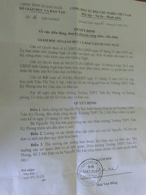 Sau một thời gian xem xét, ngày 15/1 - ông Thái Văn Đồng đã ký quyết định thuyên chuyển cô Em đến Trường THPT số 2 Mộ Đức. Theo đó, cô Em đảm nhiệm chức vụ giáo viên kể từ ngày 21/1/2013. Đồng thời, bàn giao công tác cho hiệu trưởng Trường THPT Trần Kỳ Phong trước khi đến đơn vị mới.