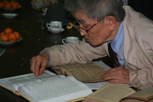 | GS Nguyễn Tài Cẩn đối chiếu một bản Truyện Kiều mới phát hiện tại Khu lưu niệm Nguyễn Du (đầu năm 2009) Ảnh: Văn hoá Nghệ An |