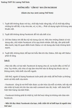 "Không nói tục chửi bậy, không dùng facebook để nói xấu ai, chỉ like khi đã đọc kĩ nội dung, status phải viết rõ ràng,…" Quy định “Những điều cấm kỵ khi lên facebook” vừa được Trường THPT DL Lương Thế Vinh (Hà Nội) đưa ra ngày 15/1.