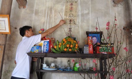 | Trong niềm vui, cậu con trai vẫn không quên tới thắp nén tâm nhang tưởng nhớ cho người cha của mình |
