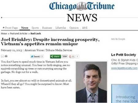 Sau khi bài viết “Despite increasing prosperity, Vietnam’s appetites remain unique” (Dù ngày càng thịnh vượng, thú ẩm thực ở Việt Nam vẫn khác thường) đăng tải cuối tháng 1/2013 trên tờ Chicago Tribune (Mỹ), cái tên Joel Brinkley trở thành mục tiêu công kích của bạn đọc khắp thế giới.