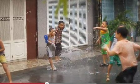 Phút nô đùa của các em nhỏ dưới trời mưa (Ảnh chụp lại từ clip) |