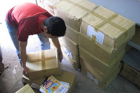 | Nhân viên Công ty TNHH Văn Hóa Hương Thủy thu nhận và đóng gói số sách công ty đã thu hồi được từ các đơn vị phát hành. |